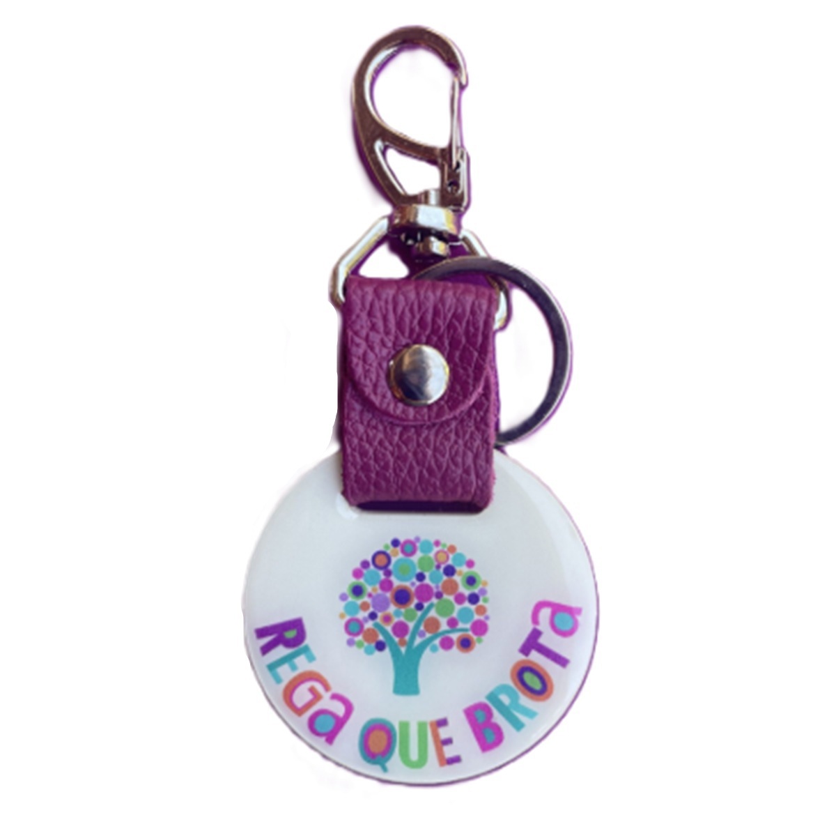 Chaveiro em couro e Resina. De um lado possui a imagem de um olho colorido, e do outro uma árvore e a escrita" Rega que brota"