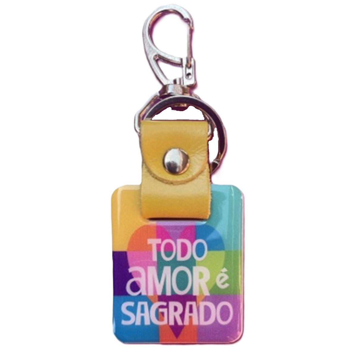 Chaveiro em couro e Resina. De um lado possui um fundo quadriculado colorido, e do outro uma árvore e a escrita "Todo amor é sagrado"