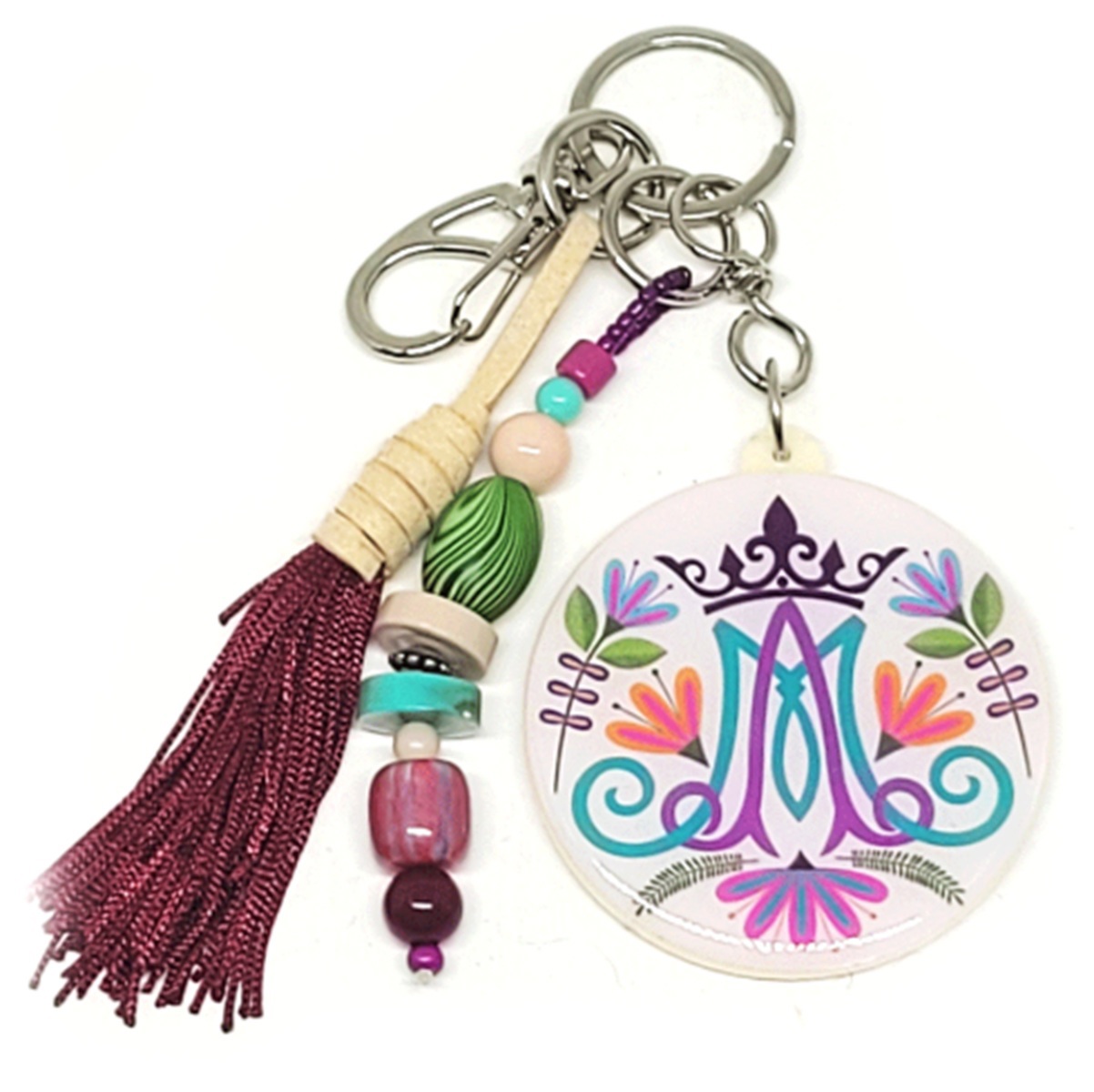 Em formato redondo, ele conta com duas estampas: num lado é apresentado um fundo branco, com as inciais A M com uma coroa, e na parte de trás a frase – "Ave Maria cheia de graças rogai por nós”. Além disso, ele é confeccionado com plástico e resina de alta qualidade, vem com argolinha de metal para colocar suas chaves e um ganchinho prático para pendurá-lo em qualquer lugar que desejar. Conta também com penduricalhos encantadores e coloridos, que conferem muito charme e alegria.