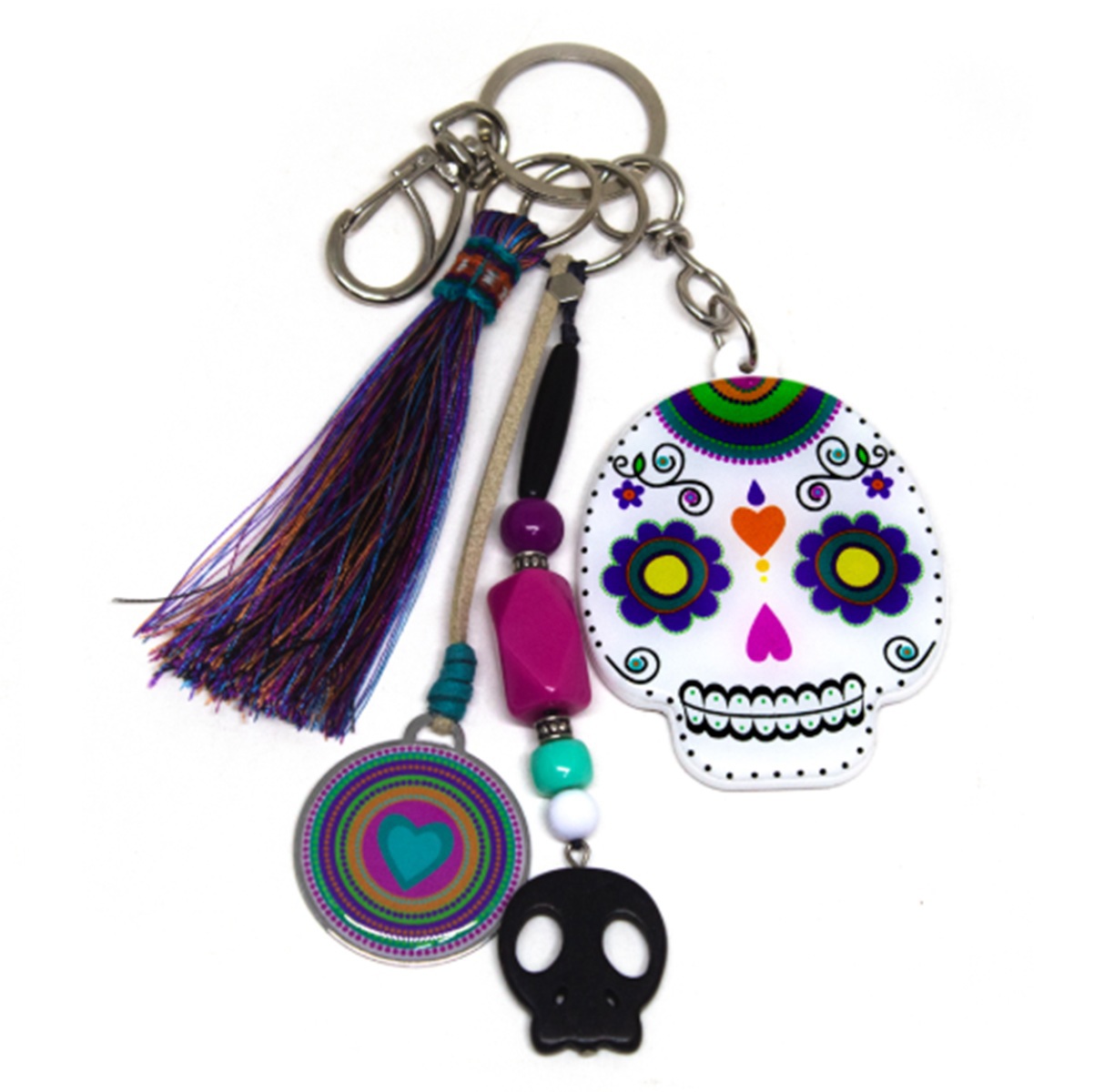 Em formato de caveira, ele conta com duas estampas: num lado é apresentado um uma caveira mexicana e na parte de trás a a frase – "Mentalize coisas boas e elas acontecerão”. Além disso, ele é confeccionado com plástico e resina de alta qualidade, vem com argolinha de metal para colocar suas chaves e um ganchinho prático para pendurá-lo em qualquer lugar que desejar. Conta também com penduricalhos encantadores e coloridos, que conferem muito charme e alegria.
