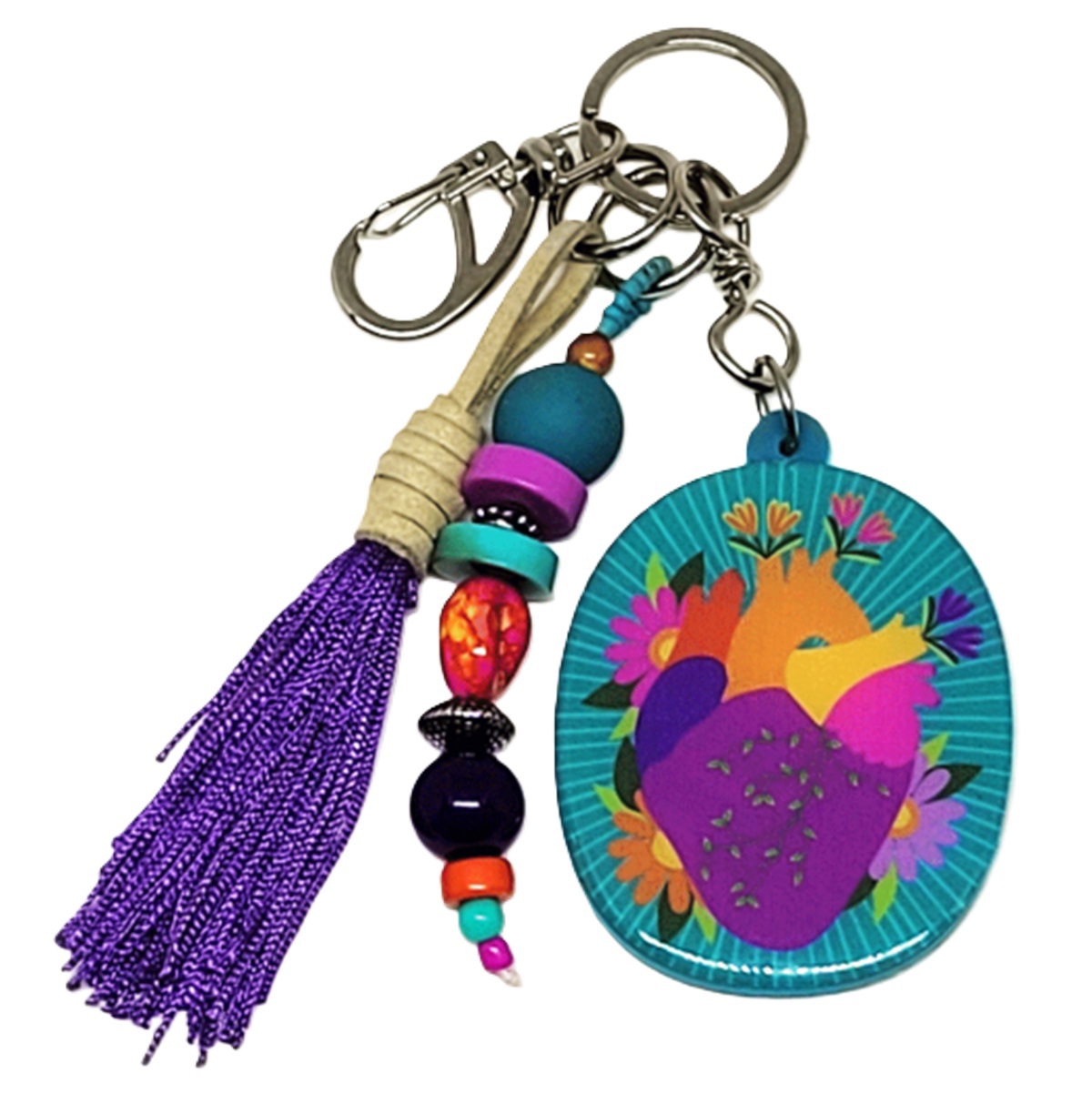 Em formato oval, ele conta com duas estampas: num lado é apresentado um fundo azul, com um coração anatômico colorido e na parte de trás a frase – "O amor me cura e me protege”. Além disso, ele é confeccionado com plástico e resina de alta qualidade, vem com argolinha de metal para colocar suas chaves e um ganchinho prático para pendurá-lo em qualquer lugar que desejar. Conta também com penduricalhos encantadores e coloridos, que conferem muito charme e alegria.