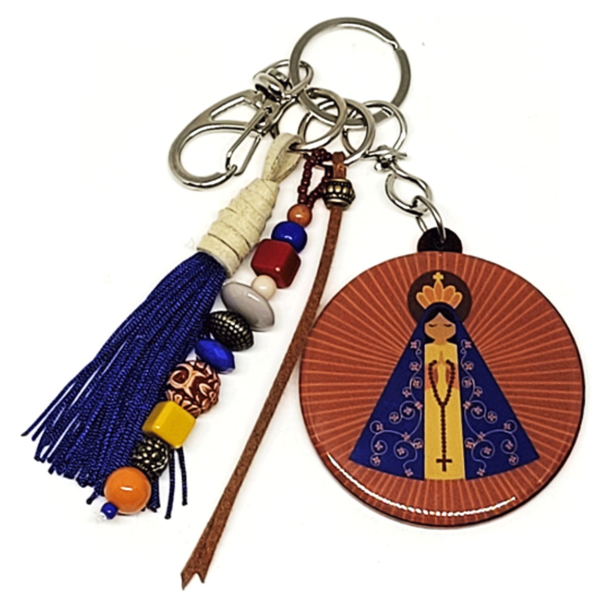 Em formato redondo, ele conta com duas estampas: num lado é apresentado um fundo marrom, com a imagem de NS Aparecida e na parte de trás a frase – "MARIA passa na frente”. Além disso, ele é confeccionado com plástico e resina de alta qualidade, vem com argolinha de metal para colocar suas chaves e um ganchinho prático para pendurá-lo em qualquer lugar que desejar. Conta também com penduricalhos encantadores e coloridos, que conferem muito charme e alegria.