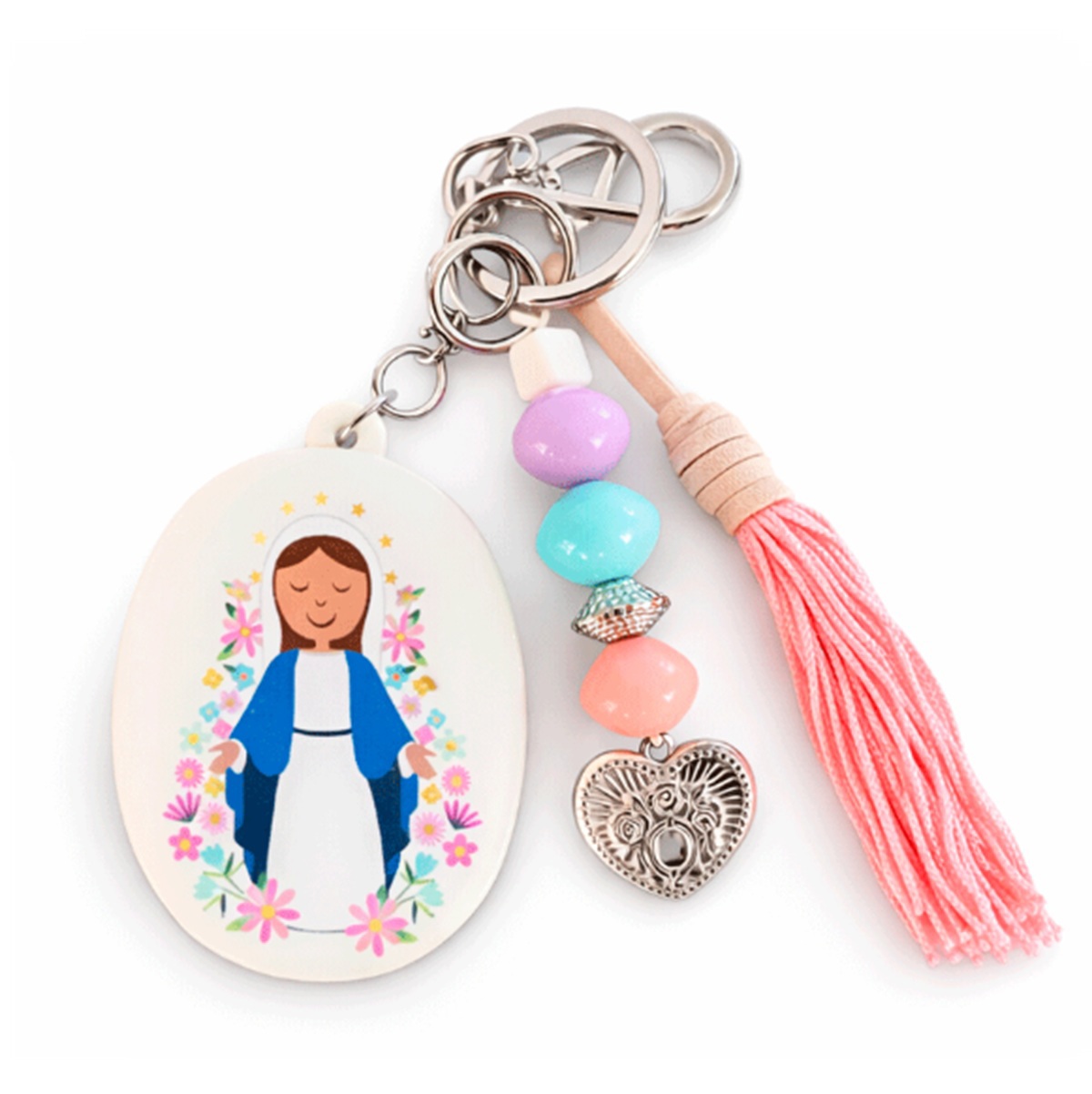 Em formato oval, ele conta com duas estampas: num lado é apresentado uma imagem de São José e na parte de trás a a frase – "N S das Graças dai-nos a benção ó mãe querida. Amém”. Além disso, ele é confeccionado com plástico e resina de alta qualidade, vem com argolinha de metal para colocar suas chaves e um ganchinho prático para pendurá-lo em qualquer lugar que desejar. Conta também com penduricalhos encantadores e coloridos, que conferem muito charme e alegria.