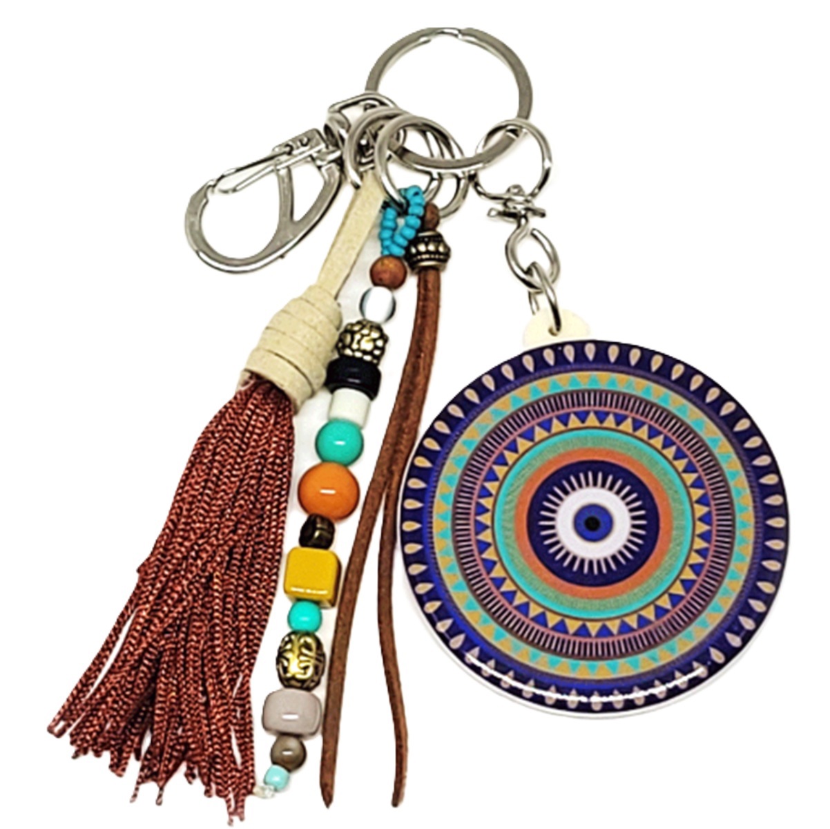 Em formato redondo, ele conta com duas estampas: num lado é apresentado um um olho grego tribal e na parte de trás a a frase – "Mentalize e sinta as boas energias”. Além disso, ele é confeccionado com plástico e resina de alta qualidade, vem com argolinha de metal para colocar suas chaves e um ganchinho prático para pendurá-lo em qualquer lugar que desejar. Conta também com penduricalhos encantadores e coloridos, que conferem muito charme e alegria.