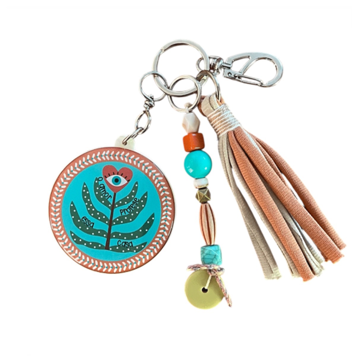 Em formato redondo, ele conta com duas estampas: num lado é apresentado uma cactus e um olho e na parte de trás a a frase – "Que a força do bem proteja essa casa. Guarde seus caminhos e que toda energia boa que aqui entre seja de paz, respieto e luz”. Além disso, ele é confeccionado com plástico e resina de alta qualidade, vem com argolinha de metal para colocar suas chaves e um ganchinho prático para pendurá-lo em qualquer lugar que desejar. Conta também com penduricalhos encantadores e coloridos, que conferem muito charme e alegria.