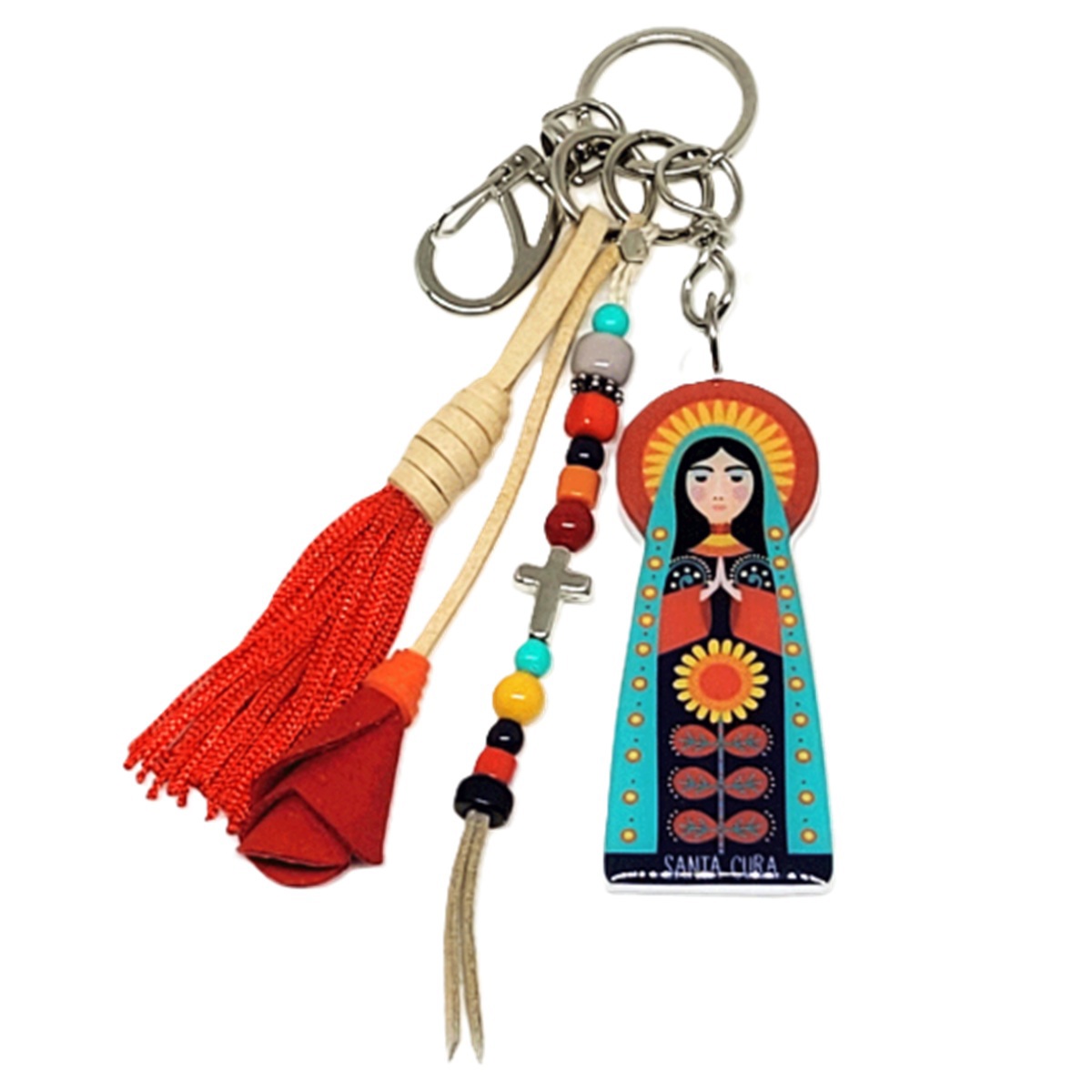Em formato de santa, ele conta com duas estampas: num lado é apresentado a parte da frente da santa e no outro, a parte de trás, com a frase – "Santa Cura toca meu corpo e minha alma com sua luz restauradora”. Além disso, ele é confeccionado com plástico e resina de alta qualidade, vem com argolinha de metal para colocar suas chaves e um ganchinho prático para pendurá-lo em qualquer lugar que desejar. Conta também com penduricalhos encantadores e coloridos, que conferem muito charme e alegria.