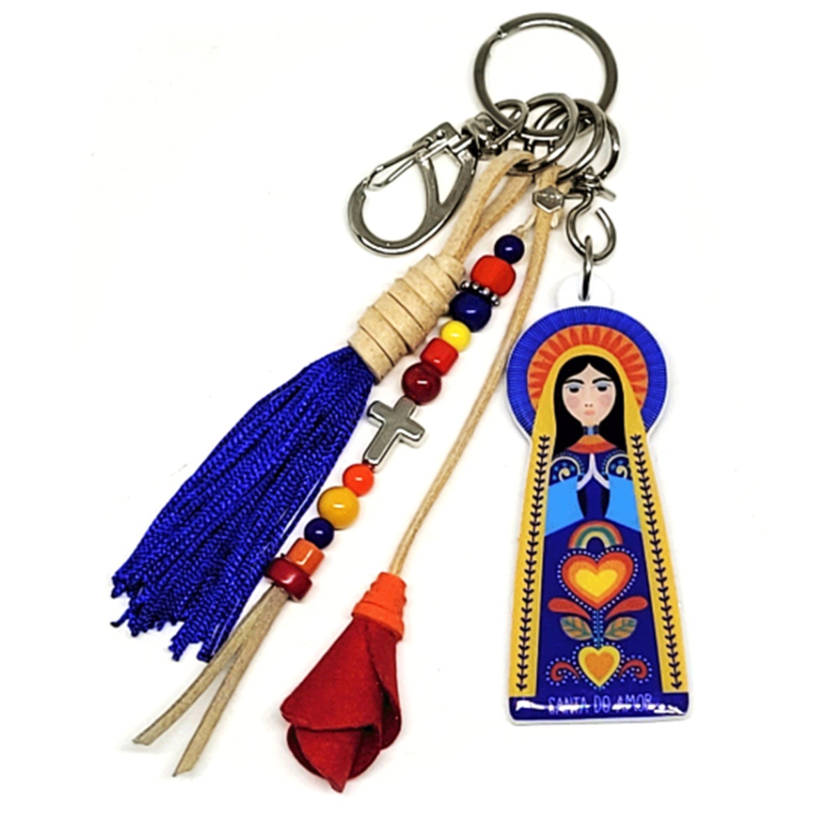 Em formato de santa, ele conta com duas estampas: num lado é apresentado a parte da frente da santa e no outro, a parte de trás, com a frase – "Santa do Amor planta em nós o amor que transforma tudo”. Além disso, ele é confeccionado com plástico e resina de alta qualidade, vem com argolinha de metal para colocar suas chaves e um ganchinho prático para pendurá-lo em qualquer lugar que desejar. Conta também com penduricalhos encantadores e coloridos, que conferem muito charme e alegria.