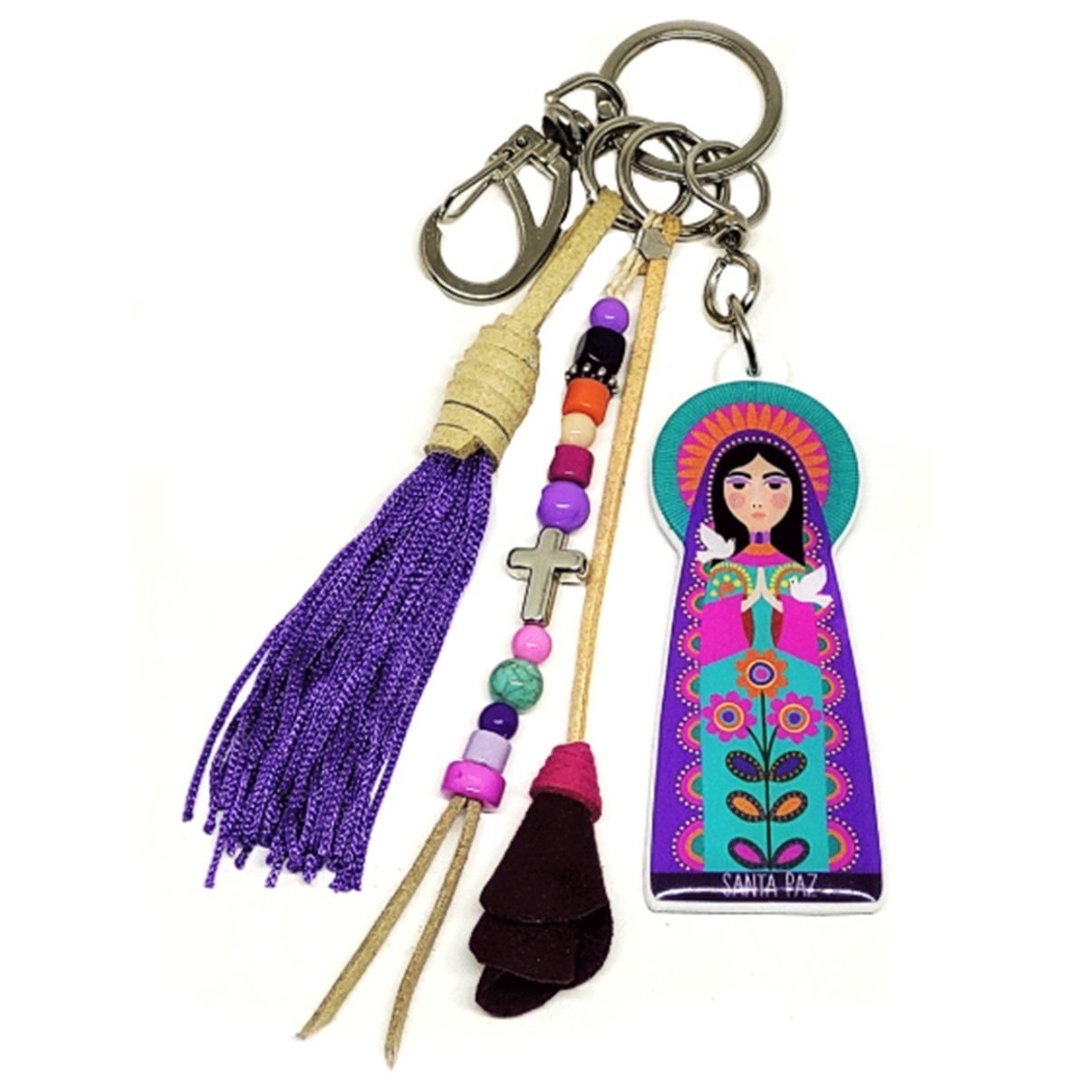 Em formato de santa, ele conta com duas estampas: num lado é apresentado a parte da frente da santa e no outro, a parte de trás, com a frase – "Santa Paz envolve o mundo com seu manto de amor e harmonia”. Além disso, ele é confeccionado com plástico e resina de alta qualidade, vem com argolinha de metal para colocar suas chaves e um ganchinho prático para pendurá-lo em qualquer lugar que desejar. Conta também com penduricalhos encantadores e coloridos, que conferem muito charme e alegria.