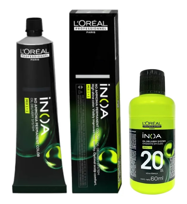 É uma revolução em tecnologia. A nova tecnologia Inoa favorece a penetração de compostos ativos para o interior da fibra, graças ao sistema ODS (oil delivery system) rico em óleos. Nesta formulação a amônia não é mais necessária, portanto é uma coloração permanente sem cheiro, proporcionando o máximo de conforto ao couro cabeludo, a fibra capilar e aos clientes. Possui clareamento de até 3 tons e cobertura de até 100% dos cabelos brancos. O sonho dos coloristas e clientes torna-se realidade com INOA, a nova coloração de Loreal Profissionnel. Loreal Profissionnel Inoa Oxidante composto por água oxigenada, óleo mineral e lonène G. Fonte de hidrogênio e dois agentes emolientes: lonèneG e um polímero catiônico ( agente estabilizador da superfície).