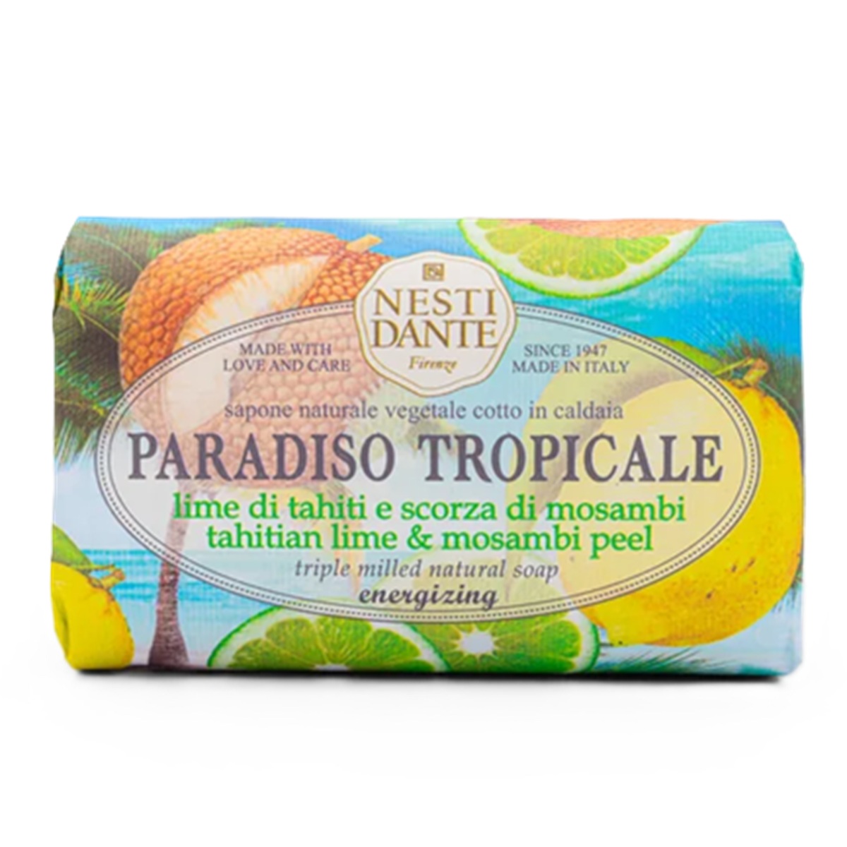 Sua fórmula suave limpa a pele com delicadeza, deixando-a macia e hidratada, enquanto a fragrância tropical perdura, trazendo frescor e bem-estar ao longo do dia. Perfeito para quem deseja transformar a rotina de cuidados em um ritual sensorial, o Sabonete Paradiso Tropicale Lima do Tahiti e Casca de Mosambi oferece o melhor da natureza, com um toque de frescor e vitalidade que revigora e suaviza a pele.