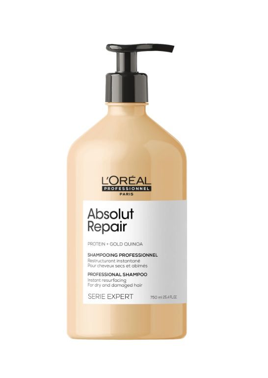 L'Oréal Professionnel Serie Expert Absolut Repair Gold Quinoa + Protein Instant Resurfacing reestrutura a fibra capilar, confere brilho e leveza durante a limpeza diária dos fios.