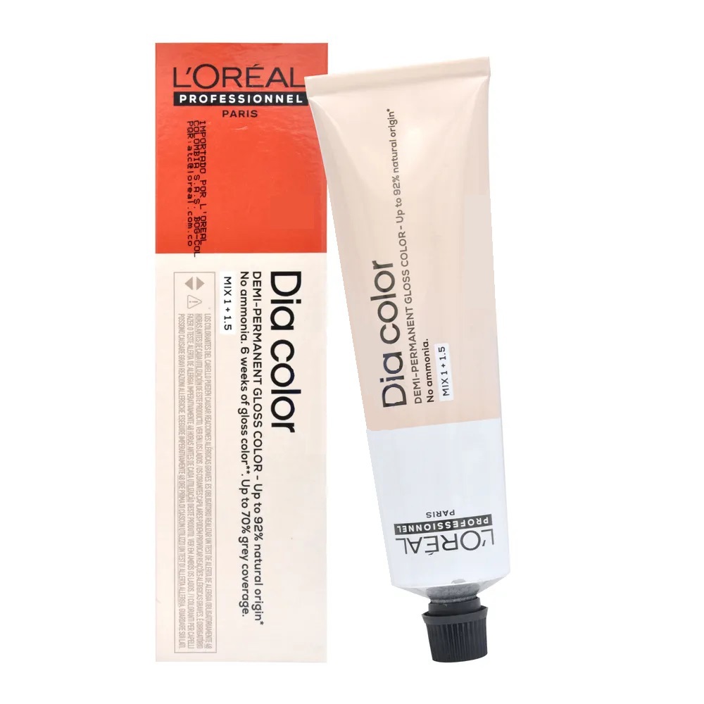 Dia Color da L'Oréal Professionnel é uma coloração alcalina demipermanente, sem amoníaco, que proporciona um cabelo com um brilho excecional. A sua fórmula reverte os efeitos da perda de melanina, oferecendo até 6 semanas de cor intensa e gloss, além de cobrir até 70% dos cabelos brancos. Esta tinta de cabelo proporciona 3 vezes mais brilho, reavivando a cor dos fios deixando-os radiante. A sua textura cremosa facilita a mistura, a aplicação e o enxaguamento, tornando o processo mais simples e confortável. Dia Color recupera a cor e o brilho através da tecnologia de reposição da melanina perdida, que replica a cor da melanina natural e preenche as lacunas ocasionadas pela sua perda. Com até 92% de ingredientes de origem natural, oferece uma opção mais suave e cuidadosa para o cabelo. Uma escolha versátil, adequada para clientes que desejam desde uma primeira experiência de coloração até uma cobertura mais completa dos cabelos brancos, proporcionando também um toque de brilho e revitalização para cabelos naturais sem vida, já que é uma tinta de cabelo suave, brilhante e de baixa manutenção.