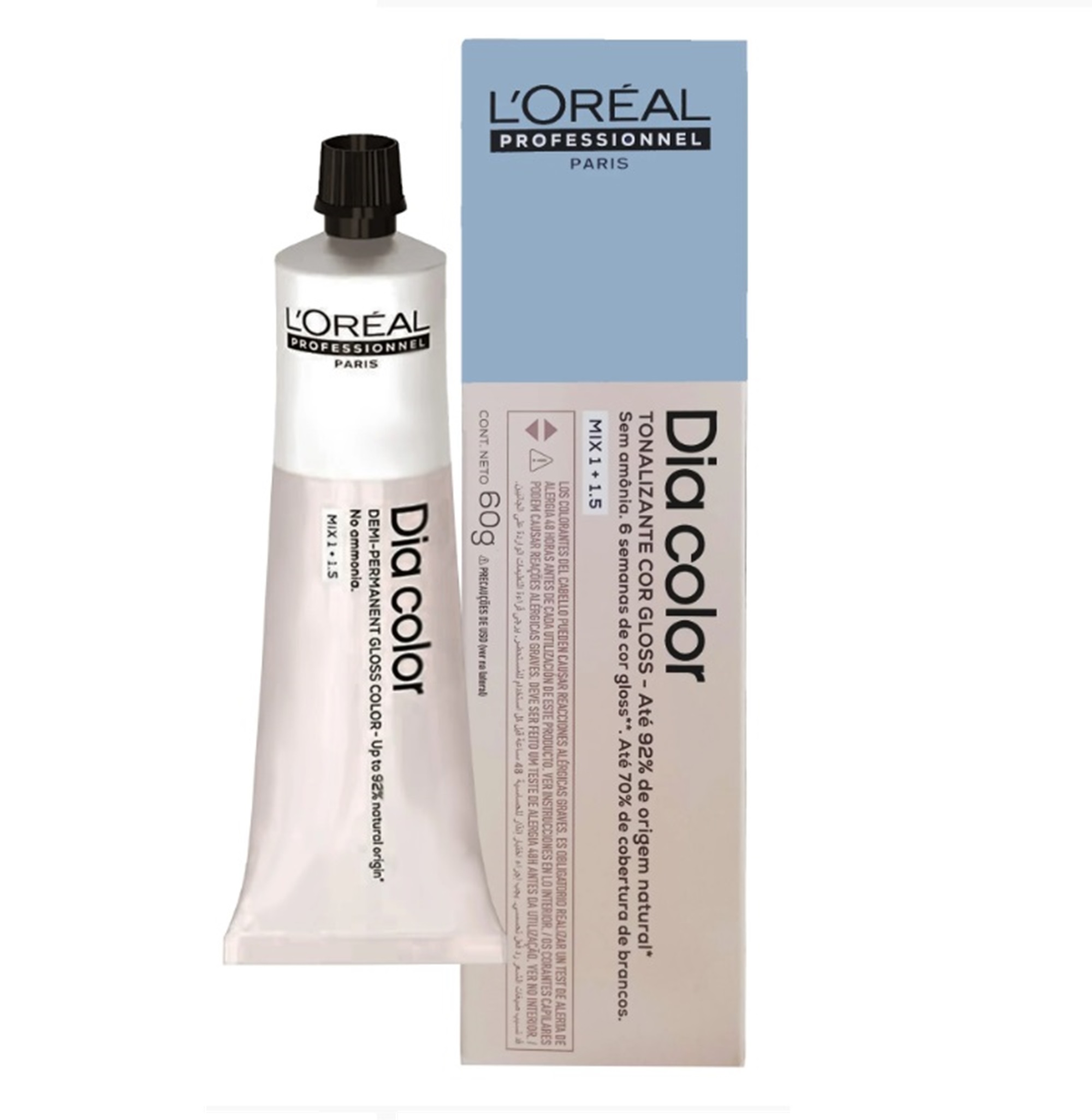 Dia Color da L'Oréal Professionnel é uma coloração alcalina demipermanente, sem amoníaco, que proporciona um cabelo com um brilho excecional. A sua fórmula reverte os efeitos da perda de melanina, oferecendo até 6 semanas de cor intensa e gloss, além de cobrir até 70% dos cabelos brancos. Esta tinta de cabelo proporciona 3 vezes mais brilho, reavivando a cor dos fios deixando-os radiante. A sua textura cremosa facilita a mistura, a aplicação e o enxaguamento, tornando o processo mais simples e confortável. Dia Color recupera a cor e o brilho através da tecnologia de reposição da melanina perdida, que replica a cor da melanina natural e preenche as lacunas causadas pela sua perda. Com até 92% de ingredientes de origem natural, oferece uma opção mais suave e cuidadosa para o cabelo. Uma escolha versátil, adequada para clientes que desejam desde uma primeira experiência de coloração até uma cobertura mais completa dos cabelos brancos, proporcionando também um toque de brilho e revitalização para cabelos naturais sem vida, já que é uma tinta de cabelo suave, brilhante e de baixa manutenção.