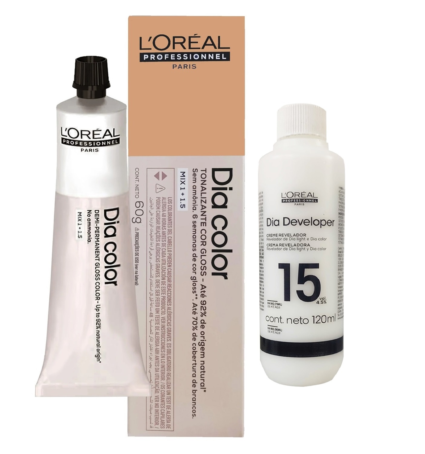 Dia Color da L'Oréal Professionnel é uma coloração alcalina demipermanente, sem amoníaco, que proporciona um cabelo com um brilho excecional. A sua fórmula reverte os efeitos da perda de melanina, oferecendo até 6 semanas de cor intensa e gloss, além de cobrir até 70% dos cabelos brancos. Esta tinta de cabelo proporciona 3 vezes mais brilho, reavivando a cor dos fios deixando-os radiante. A sua textura cremosa facilita a mistura, a aplicação e o enxaguamento, tornando o processo mais simples e confortável. Dia Color recupera a cor e o brilho através da tecnologia de reposição da melanina perdida, que replica a cor da melanina natural e preenche as lacunas ocasionadas pela sua perda. Com até 92% de ingredientes de origem natural, oferece uma opção mais suave e cuidadosa para o cabelo. Uma escolha versátil, adequada para clientes que desejam desde uma primeira experiência de coloração até uma cobertura mais completa dos cabelos brancos, proporcionando também um toque de brilho e revitalização para cabelos naturais sem vida, já que é uma tinta de cabelo suave, brilhante e de baixa manutenção.
