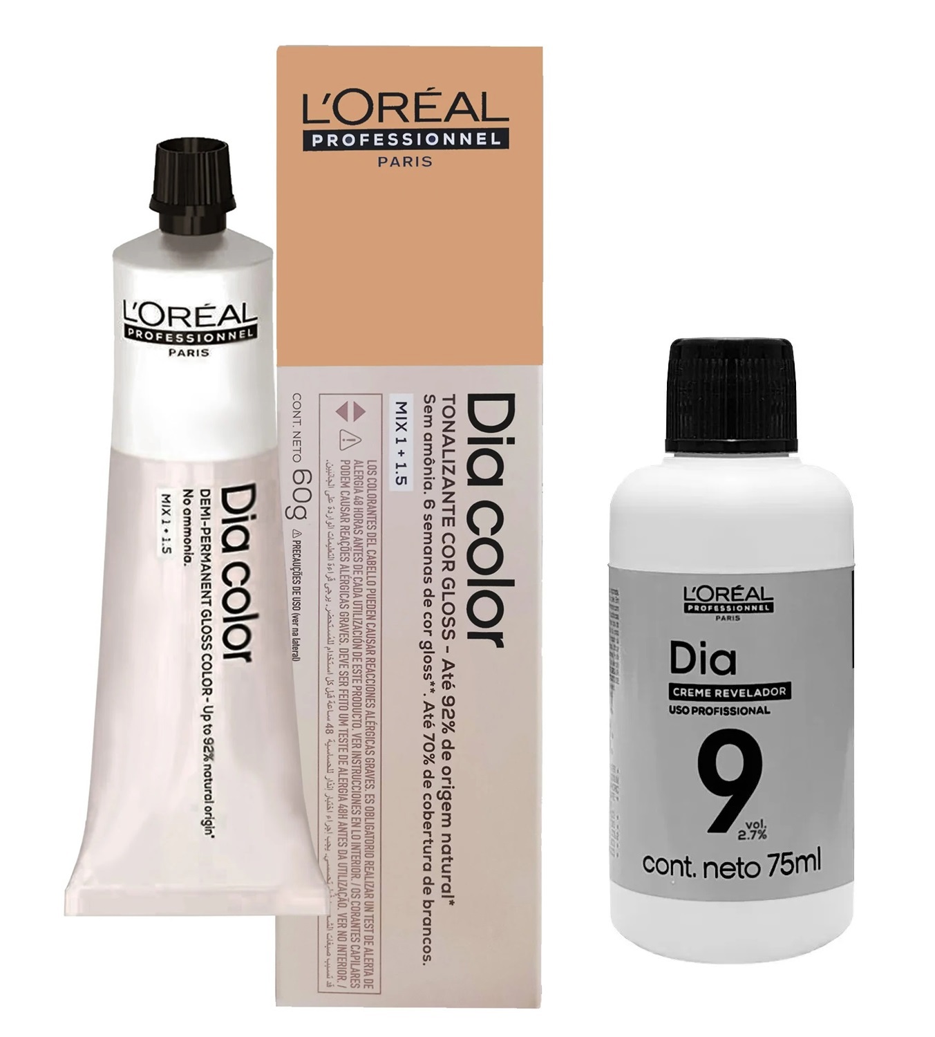 Dia Color da L'Oréal Professionnel é uma coloração alcalina demipermanente, sem amoníaco, que proporciona um cabelo com um brilho excecional. A sua fórmula reverte os efeitos da perda de melanina, oferecendo até 6 semanas de cor intensa e gloss, além de cobrir até 70% dos cabelos brancos. Esta tinta de cabelo proporciona 3 vezes mais brilho, reavivando a cor dos fios deixando-os radiante. A sua textura cremosa facilita a mistura, a aplicação e o enxaguamento, tornando o processo mais simples e confortável. Dia Color recupera a cor e o brilho através da tecnologia de reposição da melanina perdida, que replica a cor da melanina natural e preenche as lacunas ocasionadas pela sua perda. Com até 92% de ingredientes de origem natural, oferece uma opção mais suave e cuidadosa para o cabelo. Uma escolha versátil, adequada para clientes que desejam desde uma primeira experiência de coloração até uma cobertura mais completa dos cabelos brancos, proporcionando também um toque de brilho e revitalização para cabelos naturais sem vida, já que é uma tinta de cabelo suave, brilhante e de baixa manutenção.